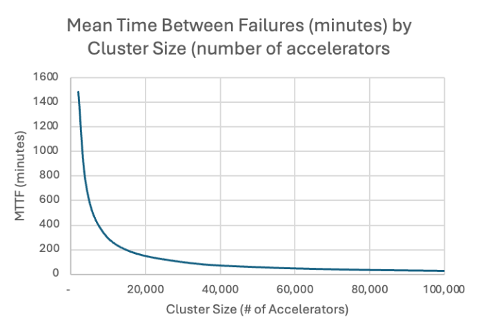 The MLPerf Storage Working Group has developed a model of the failure rates of AI clusters and estimates of the target checkpoint intervals based on real-world data. Meta’s “Llama3: Herd of Models” paper provides information about failure rates seen at scale (https://arxiv.org/abs/2407.21783). In that paper, Meta describes the training cluster used (16,000 accelerators) to train the Llama 3 models. The training process took 54 days and encountered 419 failures. The majority of these failures scale with the size of the cluster, and assuming the failures are uniformly distributed over time yields a model for the Mean Time Between Failures (MTTF) as the cluster size scales up: